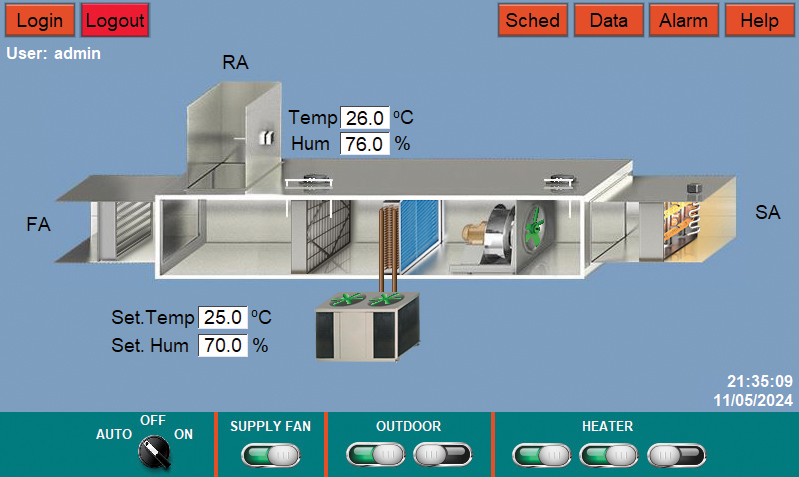 – Màn hình hiển thị HMI: màn hình hiển thị HMI cho phép giám sát và điều khiển toàn bộ các thông số hoạt động của hệ thống AHU như trạng thái hoạt động, trạng thái lỗi của thiết bị; các thông số về nhiệt độ, độ ẩm, áp suất, nồng độ khí CO2,… từ các thiết bị đo; lưu trữ lại các tham số điều khiển, danh sách lỗi trong quá trình vận hành.